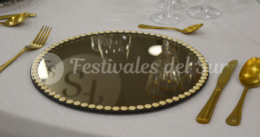 Si estás buscando un toque original para la mesa de tu evento, ¡no dudes en alquilar nuestro Bajo Plato Espejo para tu evento! Tiene un diseño muy sencillo y en el borde, por todo el bajo plato, unos detalles decorativos preciosos.