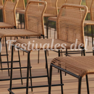 Fabricado en acero de color negro y asiento y respaldo de cuerda sintética en color natural. Perfecto para eventos tanto en interior como en exterior.